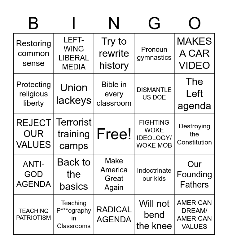 This bingo card has a free space and 24 words: TEACHING PATRIOTISM, Back to the basics, Bible in every classroom, Will not bend the knee, MAKES A CAR VIDEO, Restoring common sense, LEFT-WING LIBERAL MEDIA, Try to rewrite history, FIGHTING WOKE IDEOLOGY/ WOKE MOB, Destroying the Constitution, REJECT OUR VALUES, Union lackeys, Indoctrinate our kids, Our Founding Fathers, Protecting religious liberty, Teaching P***ography in Classrooms, RADICAL AGENDA, Pronoun gymnastics, The Left agenda, ANTI-GOD AGENDA, Terrorist training camps, Make America Great Again, DISMANTLE US DOE and AMERICAN DREAM/ AMERICAN VALUES.