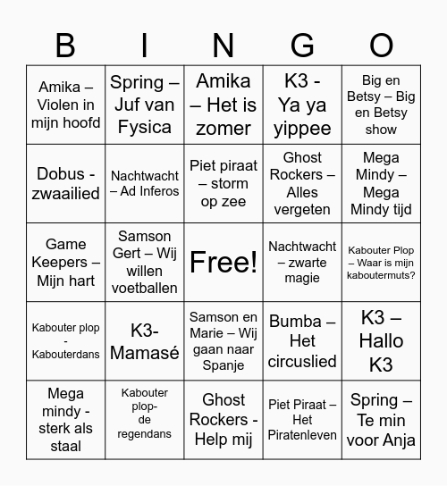 This bingo card has a free space and 24 words: K3- Mamasé, Kabouter plop- de regendans, Piet piraat – storm op zee, Mega mindy - sterk als staal, Big en Betsy – Big en Betsy show, Amika – Violen in mijn hoofd, Dobus - zwaailied, Spring – Juf van Fysica, Nachtwacht – zwarte magie, Samson en Marie – Wij gaan naar Spanje, Ghost Rockers – Alles vergeten, Game Keepers – Mijn hart, Bumba – Het circuslied, K3 – Hallo K3, Nachtwacht – Ad Inferos, Piet Piraat – Het Piratenleven, Kabouter Plop – Waar is mijn kaboutermuts?, Amika – Het is zomer, Mega Mindy – Mega Mindy tijd, Samson Gert – Wij willen voetballen, Spring – Te min voor Anja, Kabouter plop - Kabouterdans, K3 - Ya ya yippee and Ghost Rockers - Help mij.