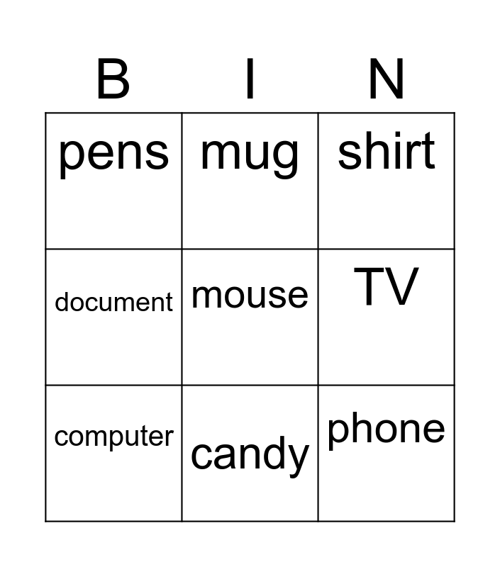 This bingo card has a free space and 8 words: TV, shirt, mug, computer, pens, phone, document and candy.