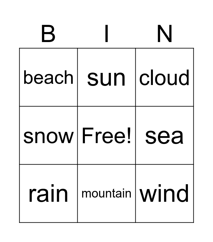 This bingo card has a free space and 8 words: sea, cloud, sun, rain, beach, wind, snow and mountain.