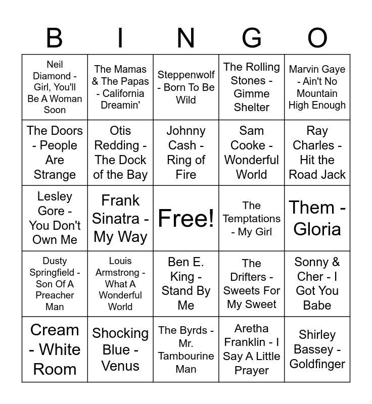 This bingo card has a free space and 34 words: Bob Dylan - Like A Rolling Stone, Aretha Franklin - I Say A Little Prayer, The Beatles - Yesterday, Simon & Garfunkel - Mrs. Robinson, Dusty Springfield - Son Of A Preacher Man, Otis Redding - The Dock of the Bay, Marvin Gaye - Ain't No Mountain High Enough, Cream - White Room, The Mamas & The Papas - California Dreamin', The Beach Boys - Good Vibrations, Johnny Cash - Ring of Fire, Steppenwolf - Born To Be Wild, The Monkees - I'm a Believer, The Turtles - Happy Together, The Temptations - My Girl, Ray Charles - Hit the Road Jack, Shocking Blue - Venus, Lesley Gore - You Don't Own Me, Louis Armstrong - What A Wonderful World, The Drifters - Sweets For My Sweet, Ben E. King - Stand By Me, The Moody Blues - Nights, Neil Diamond - Girl, You'll Be A Woman Soon, Them - Gloria, The Byrds - Mr. Tambourine Man, Shirley Bassey - Goldfinger, The Rolling Stones - Gimme Shelter, Nancy Sinatra - Bang Bang, Sam Cooke - Wonderful World, The Doors - People Are Strange, Nina Simone - I Put A Spell On You, Frank Sinatra - My Way, Sonny & Cher - I Got You Babe and Nina Simone - Here Comes The Sun.