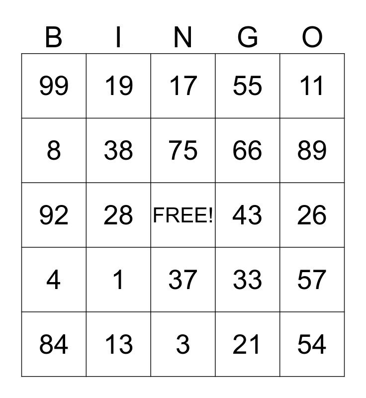 This bingo card has a free space and 24 words: 1, 13, 75, 84, 11, 99, 8, 19, 43, 37, 66, 92, 33, 57, 38, 21, 26, 17, 89, 28, 54, 4, 55 and 3.