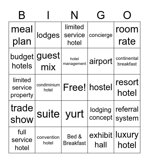This bingo card has a free space and 24 words: full service hotel, suite, hotel management, exhibit hall, room rate, meal plan, lodges, limited service hotel, hostel, resort hotel, limited service property, guest mix, lodging concept, referral system, budget hotels, convention hotel, Bed & Breakfast, concierge, continental breakfast, trade show, condiminium hotel, yurt, airport and luxury hotel.