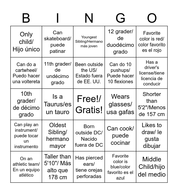 This bingo card has a free space and 24 words: Oldest Sibling/ hermano mayor, Taller than 5'10"/ Más alto que 178 cm, Been outside the US/ Estado fuera de EE. UU., On an athletic team/ En un equipo atlético, Favorite color is red/ color favorito es el rojo, Only child/ Hijo único, Can do a cartwheel/ Puedo hacer una voltereta, Can skateboard/ puede patinar, Wears glasses/ usa gafas, Born outside DC/ Nacido fuera de DC, Can do 10 pushups/ Puede hacer 10 flexiones, 10th grader/ de décimo grado, Can cook/ puede cocinar, Likes to draw/ le gusta dibujar, 11th grader/ de undécimo grado, Favorite color is blue/color favorito es el azul, Shorter than 5'2"/Menos de 157 cm, Youngest Sibling/Hermano más joven, Has a driver's license/tiene licencia de conducir, Is a Taurus/es un tauro, Middle Child/hijo del medio, Can play an instrument/ puede tocar un instrumento, 12 grader/ de duodécimo grado and Has pierced ears/ tiene orejas perforadas.