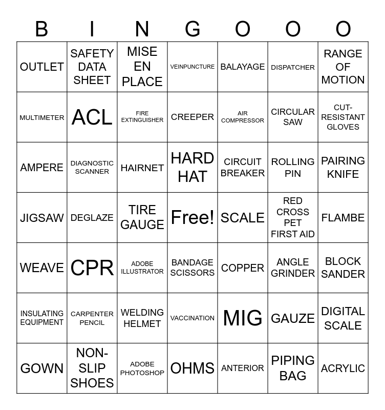 This bingo card has a free space and 135 words: BAIN-MARIE, BOWL SCRAPER, DIGITAL SCALE, PASTRY BRUSH, OFFSET SPATULA, ZEST, PAIRING KNIFE, CHEF’S KNIFE, ROLLING PIN, PIPING BAG, XEROX PRINTER, VINYL PLOTTER, ADOBE PHOTOSHOP, XACTO KNIFE, BRANDING, CAMERA, ADOBE ILLUSTRATOR, COMB BINDING, SADDLE STICHING, TYPOGRAPHY, DEGLAZE, FLAMBE, MISE EN PLACE, TEMPERING, WHISK, HAIRNET, CUT-RESISTANT GLOVES, NON-SLIP SHOES, KITCHEN APRON, OVEN MITTS, DIAGNOSTIC SCANNER, CREEPER, TIRE GAUGE, AIR COMPRESSOR, BRAKE BLEEDER KIT, VISE GRIPS, WRENCH, SOCKETS, FLOOR JACK, EYE PROTECTION, CIRCULAR SAW, TAPE MEASURE, LEVEL, CLAW HAMMER, UTILITY KNIFE, JIGSAW, CHISEL, CARPENTER PENCIL, HARD HAT, EARPLUGS, EYEWASH STATION, BLOCK SANDER, AIR PAINT SPRAY GUN, PUTTY KNIFE, TOPCOAT, DETAILING, ESTIMATE, MASKING, PRIMER, VIN, ACRYLIC, BALAYAGE, FACIAL, MANICURE, MICROBLADE, WEAVE, ALLERGIC REACTION, SCISSORS, RAZOR, SAFETY DATA SHEET, CIRCUIT BREAKER, AMPERE, COPPER, FUSE, GFCI, KILOWATTS, MULTIMETER, OHMS, OUTLET, INSULATING EQUIPMENT, ANTISEPTIC, VEINPUNCTURE, ANTICOAGULANT, EDEMA, GOWN, RESPIRATOR, MASK, STETHOSCOPE, SCALE, THERMOMETER, CPR, DISPATCHER, EMS, FIRST RESPONDER, TRIAGE, ANTERIOR, HEMATOMA, TRAUMA, BLOOD PRESSURE, AED, GAUZE, ACL, CONTUSION, ACUTE, ATHLETIC TAPE, BANDAGE SCISSORS, BMI, CERTIFIED PERSONAL TRAINER, ENDORPHINS, STOP THE BLEED, NUTRITION, RANGE OF MOTION, VITAL SIGNS, OSHA, RED CROSS PET FIRST AID, DIAGNOSIS, VACCINATION, BATHING, ULTRASOUND IMAGING, TISSUE SAMPLE, PATIENT SCHEDULING, RADIOGRAPHS, STERILIZING EQUIPMENT, GROOMING, WELDING JACKET, WELDING HELMET, STEEL TOED WORK SHOES, ANGLE GRINDER, HAND FILE, SPEED SQUARE, MIG, WELDING TORCH, SOAPSTONE, FIRE EXTINGUISHER and FIRST AID KIT.