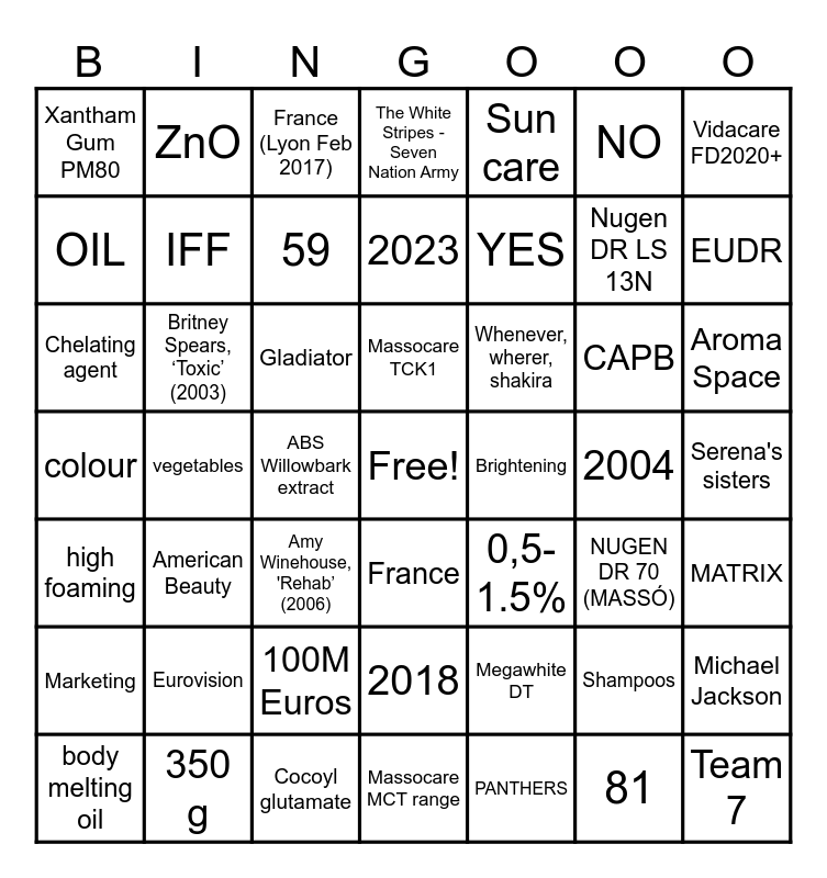 This bingo card has a free space and 66 words: medium polar, high foaming, cationic, CAPB, Brightening, solid, ZnO, D5, OIL, Cocoyl glutamate, Massocare TCK1, Shampoos, Chelating agent, Sun care, beta-sitosterol, NO, YES, Xantham Gum PM80, Massocare HEU, IFF, Gladiator, Britney Spears, ‘Toxic’ (2003), The White Stripes - Seven Nation Army, Amy Winehouse, 'Rehab’ (2006), Gnarls Barkley, 'Crazy' (2006), MATRIX, 0,5-1.5%, 2001, Nugen DR LS 13N, Eurovision, Aroma Space, Megawhite DT, Pyrogen Free, What a girl wants, Christina Aguilera, Whenever, wherer, shakira, colour, Michael Jackson, 2023, ABS Willowbark extract, Marketing, Vidacare FD2020+, 2004, EUDR, Juan Pablo II, Massocare MCT range, France, 59, body melting oil, Team 7, Serena's sisters, PANTHERS, DRAGON, PEDRO Almodovar, 2002, Czecj Republic, American Beauty, 91,8Meuros, 2018, France (Lyon Feb 2017), vegetables, NUGEN DR 70 (MASSÓ), aroma space, 81, 350 g, 100M Euros and Toy story.