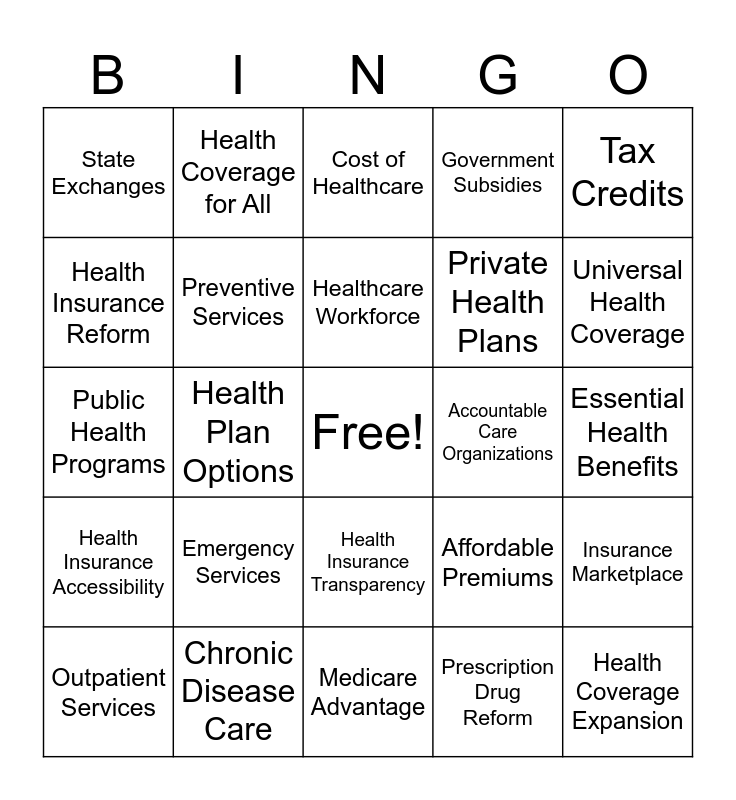 This bingo card has a free space and 24 words: Emergency Services, Chronic Disease Care, Healthcare Workforce, Outpatient Services, Tax Credits, State Exchanges, Health Insurance Reform, Health Coverage for All, Accountable Care Organizations, Health Insurance Transparency, Private Health Plans, Public Health Programs, Affordable Premiums, Insurance Marketplace, Preventive Services, Prescription Drug Reform, Essential Health Benefits, Cost of Healthcare, Universal Health Coverage, Health Plan Options, Health Coverage Expansion, Health Insurance Accessibility, Government Subsidies and Medicare Advantage.