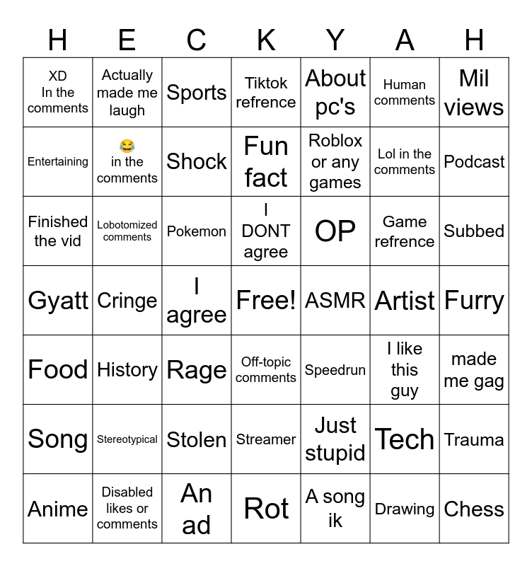 This bingo card has a free space and 48 words: Just stupid, Lol in the comments, Rot, Cringe, Pokemon, Furry, Actually made me laugh, Disabled likes or comments, Human comments, Off-topic comments, Mil views, Tiktok refrence, Game refrence, OP, Song, Artist, Entertaining, Podcast, Tech, About pc's, Roblox or any games, I agree, XD In the comments, 😂 in the comments, Trauma, Shock, Subbed, Anime, I DONT agree, Lobotomized comments, Drawing, ASMR, made me gag, Stereotypical, Gyatt, Speedrun, I like this guy, Finished the vid, Rage, Stolen, Food, Chess, Sports, An ad, Fun fact, Streamer, History and A song ik.