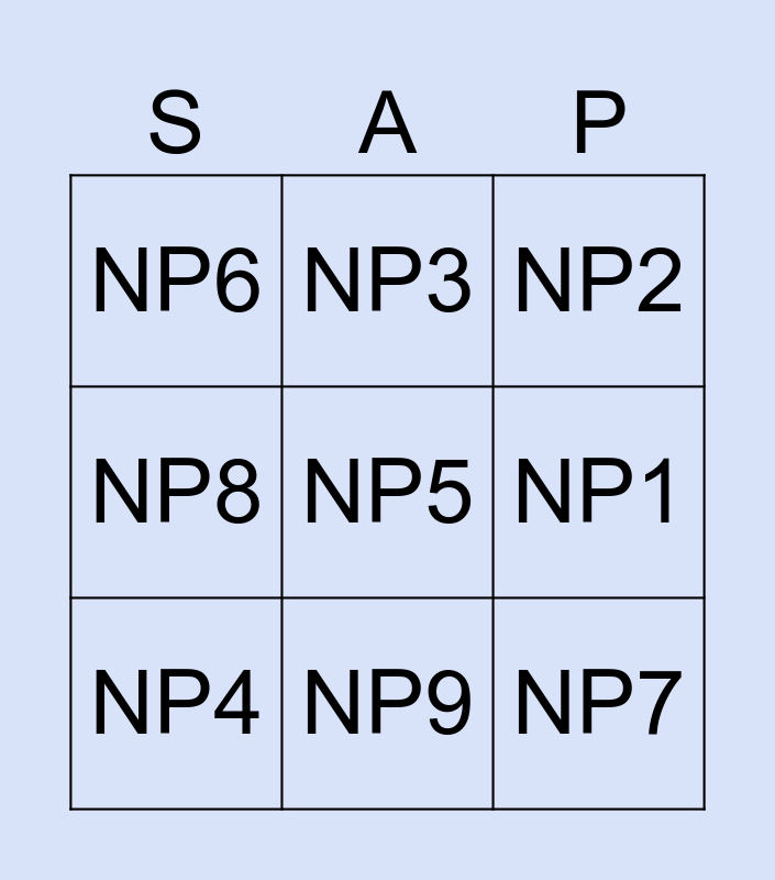 This bingo card has a free space and 8 words: NP1, NP2, NP3, NP4, NP6, NP7, NP8 and NP9.