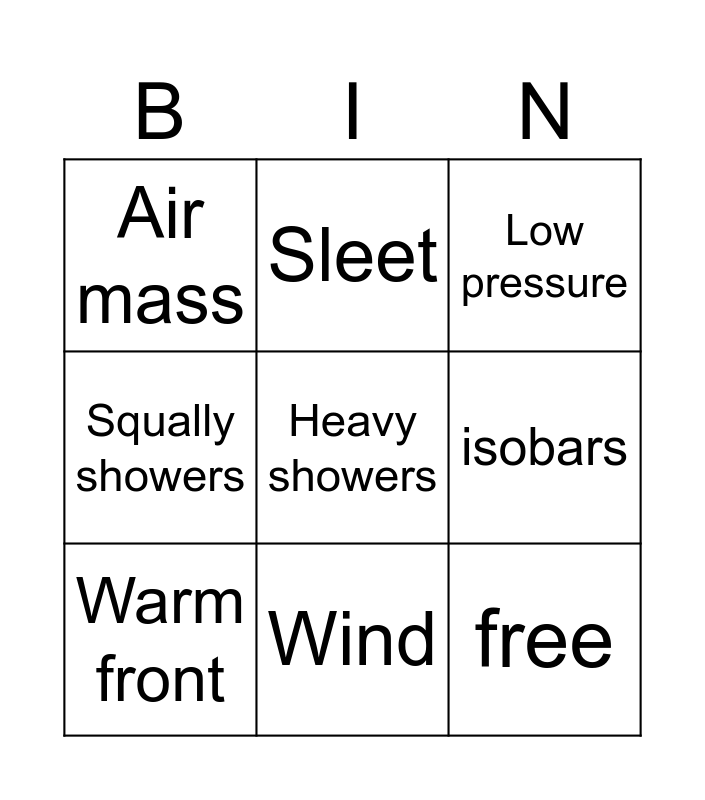 This bingo card has 21 words: Cold front, High Pressure, Sleet, Rain, Gusts, Warm front, Air mass, Low pressure, Atlantic Ocean, Wind, free, Squally showers, Depression, Anticyclone, isobars, Storm, Unsettled, drizzle, Heavy showers, Wet and Flooding.