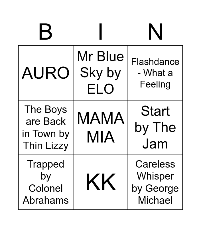 This bingo card has 27 words: I Can't Go For That by Hall & Oates, Don't Stop Me Now by Queen, Careless Whisper by George Michael, Boogie Oogie by Taste of Honey, Start by The Jam, Flashdance - What a Feeling, Mr Blue Sky by ELO, There Must be an Angel by Eurythmics, I Can't Go For That by Hall & Oates, Last Christmas by Wham!, Dead Ringer For Love by Meatloaf, The Boys are Back in Town by Thin Lizzy, Heart of Glass by Blondie, Go Your Own Way by Fleetwood Mac, Like a Prayer by Madonna, Total Eclipse of the Heart by Bonnie Tyler, Trapped by Colonel Abrahams, KK, Cuddly Toy by Roachford, AURO, A Little Respect by Erasure, Sympathy for the Devil by The Rolling Stones, Groove is in the Heart by Dee-Lite, September by Earth, Wind & Fire, Wanna be Startin' Somethin' by Michael Jackson, MAMA MIA and CALL ME.