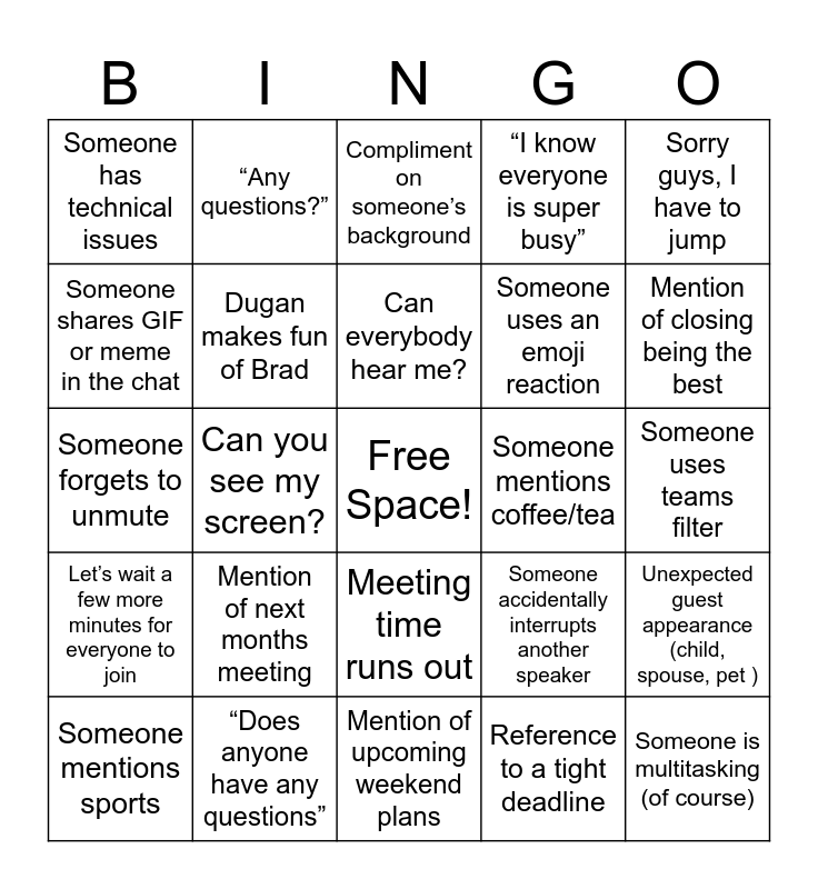 This bingo card has a free space and 24 words: Mention of next months meeting, “Does anyone have any questions”, Can everybody hear me?, Someone mentions sports, Sorry guys, I have to jump, Someone has technical issues, Someone shares GIF or meme in the chat, “Any questions?”, Someone mentions coffee/tea, Meeting time runs out, Someone uses an emoji reaction, Someone forgets to unmute, Someone accidentally interrupts another speaker, Unexpected guest appearance (child, spouse, pet ), Dugan makes fun of Brad, Reference to a tight deadline, Someone uses teams filter, Compliment on someone’s background, Mention of closing being the best, Can you see my screen?, Someone is multitasking (of course), Let’s wait a few more minutes for everyone to join, “I know everyone is super busy” and Mention of upcoming weekend plans.