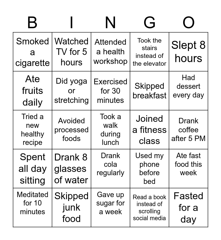 This bingo card has a free space and 24 words: Drank 8 glasses of water, Skipped junk food, Exercised for 30 minutes, Meditated for 10 minutes, Slept 8 hours, Smoked a cigarette, Ate fruits daily, Watched TV for 5 hours, Joined a fitness class, Drank cola regularly, Skipped breakfast, Tried a new healthy recipe, Used my phone before bed, Ate fast food this week, Did yoga or stretching, Read a book instead of scrolling social media, Drank coffee after 5 PM, Attended a health workshop, Had dessert every day, Avoided processed foods, Fasted for a day, Spent all day sitting, Took the stairs instead of the elevator and Gave up sugar for a week.