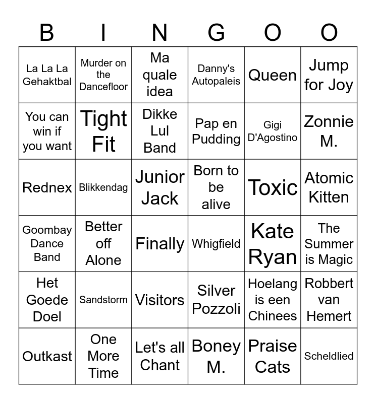 This bingo card has 36 words: Silver Pozzoli, Visitors, Boney M., You can win if you want, Goombay Dance Band, Born to be alive, Tight Fit, Let's all Chant, Queen, Hoelang is een Chinees, Zonnie M., Danny's Autopaleis, Robbert van Hemert, Blikkendag, Pap en Pudding, La La La Gehaktbal, Het Goede Doel, Toxic, Rednex, Ma quale idea, Junior Jack, Better off Alone, Whigfield, Finally, Kate Ryan, Murder on the Dancefloor, Gigi D'Agostino, One More Time, Dikke Lul Band, Jump for Joy, Scheldlied, Outkast, The Summer is Magic, Atomic Kitten, Sandstorm and Praise Cats.