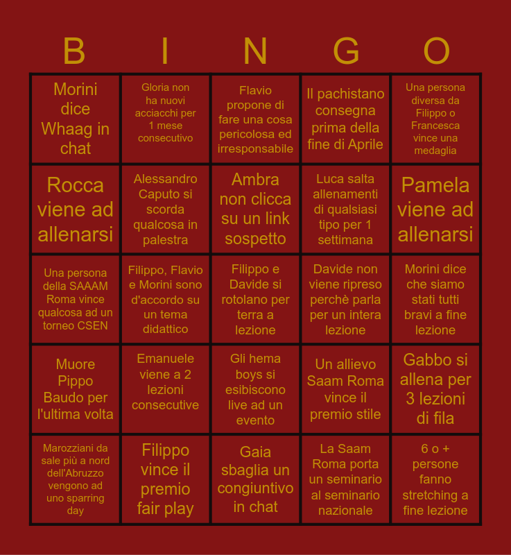 This bingo card has a free space and 24 words: Emanuele viene a 2 lezioni consecutive, Filippo vince il premio fair play, Ambra non clicca su un link sospetto, Marozziani da sale più a nord dell'Abruzzo vengono ad uno sparring day, Una persona diversa da Filippo o Francesca vince una medaglia, Morini dice Whaag in chat, Rocca viene ad allenarsi, Gloria non ha nuovi acciacchi per 1 mese consecutivo, Davide non viene ripreso perchè parla per un intera lezione, Gli hema boys si esibiscono live ad un evento, Luca salta allenamenti di qualsiasi tipo per 1 settimana, Una persona della SAAAM Roma vince qualcosa ad un torneo CSEN, Un allievo Saam Roma vince il premio stile, Gabbo si allena per 3 lezioni di fila, Alessandro Caputo si scorda qualcosa in palestra, La Saam Roma porta un seminario al seminario nazionale, Morini dice che siamo stati tutti bravi a fine lezione, Flavio propone di fare una cosa pericolosa ed irresponsabile, Pamela viene ad allenarsi, Filippo, Flavio e Morini sono d'accordo su un tema didattico, 6 o + persone fanno stretching a fine lezione, Muore Pippo Baudo per l'ultima volta, Il pachistano consegna prima della fine di Aprile and Gaia sbaglia un congiuntivo in chat.