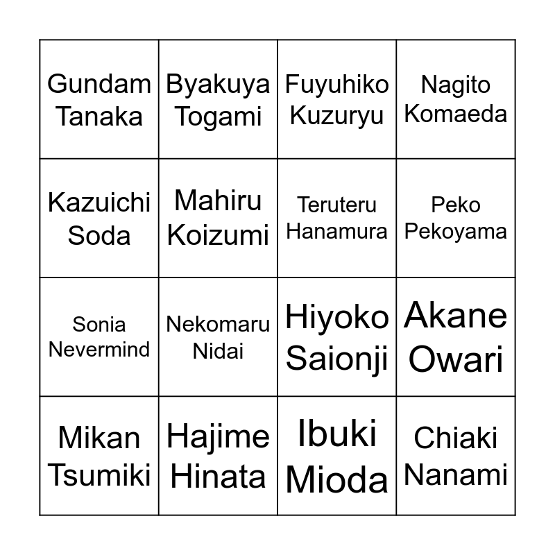This bingo card has 16 words: Hajime Hinata, Akane Owari, Fuyuhiko Kuzuryu, Gundam Tanaka, Sonia Nevermind, Byakuya Togami, Hiyoko Saionji, Ibuki Mioda, Kazuichi Soda, Mahiru Koizumi, Mikan Tsumiki, Nagito Komaeda, Nekomaru Nidai, Peko Pekoyama, Teruteru Hanamura and Chiaki Nanami.
