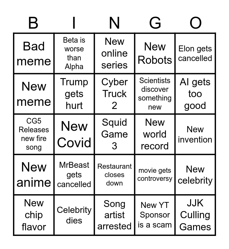 This bingo card has a free space and 24 words: MrBeast gets cancelled, Celebrity dies, Cyber Truck 2, New chip flavor, Elon gets cancelled, Bad meme, New meme, Beta is worse than Alpha, New world record, Restaurant closes down, Scientists discover something new, CG5 Releases new fire song, movie gets controversy, New celebrity, Trump gets hurt, New YT Sponsor is a scam, New invention, New online series, AI gets too good, New Covid, JJK Culling Games, New anime, New Robots and Song artist arrested.