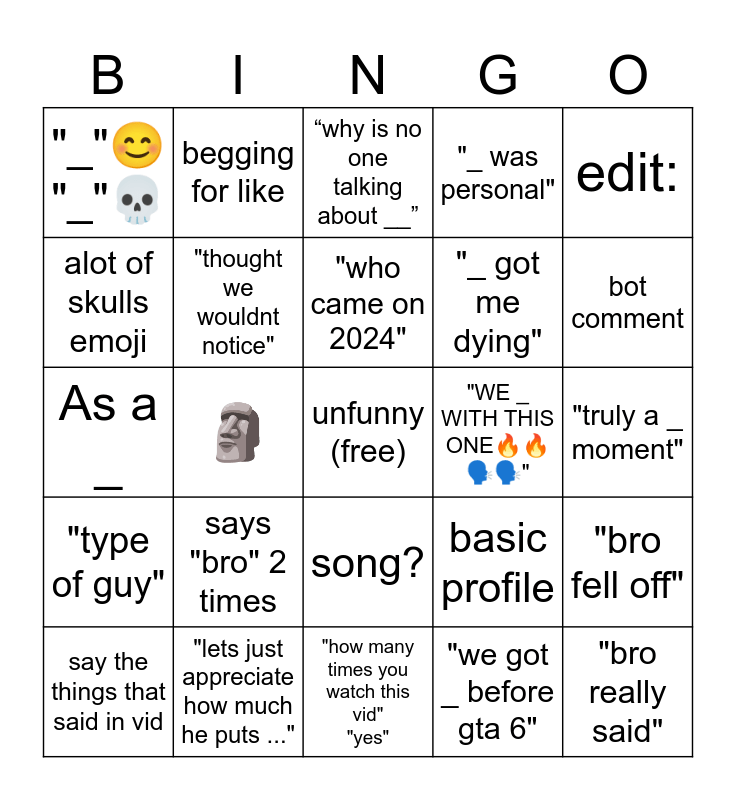 This bingo card has a free space and 24 words: says "bro" 2 times, "lets just appreciate how much he puts ...", "who came on 2024", say the things that said in vid, edit:, "_"π "_"π, alot of skulls emoji, begging for like, "WE _ WITH THIS ONEπ₯π₯π£οΈπ£οΈ", song?, "_ got me dying", As a _, basic profile, "bro fell off", "thought we wouldnt notice", "we got _ before gta 6", "truly a _ moment", βwhy is no one talking about __β, bot comment, πΏ, "bro really said", "type of guy", "_ was personal" and "how many times you watch this vid" "yes".