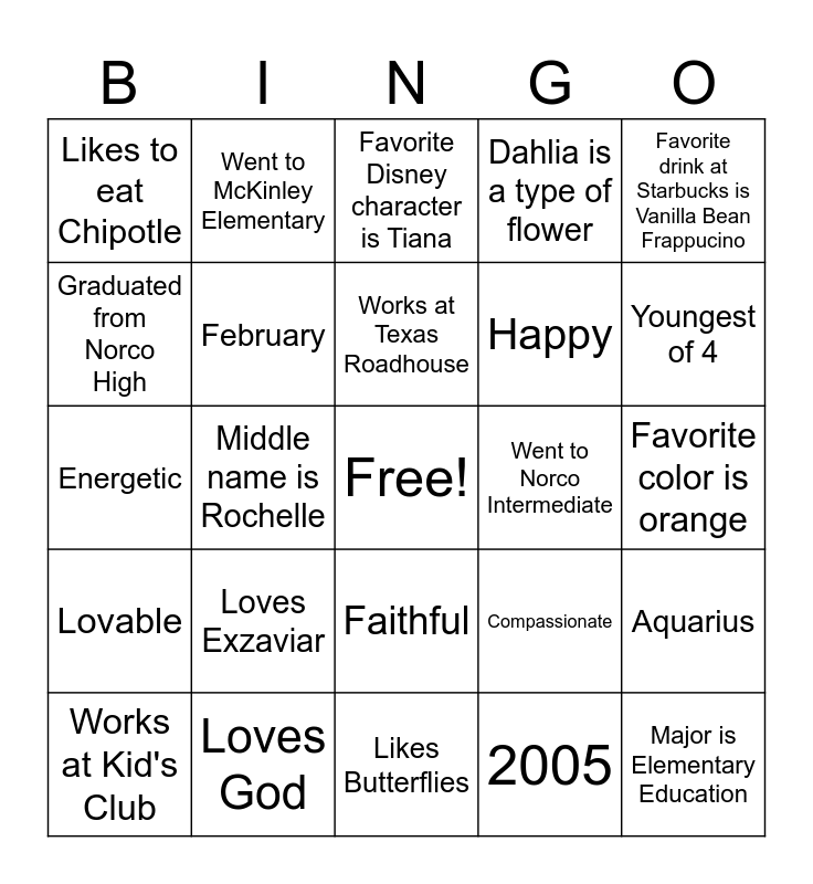 This bingo card has a free space and 24 words: Loves Exzaviar, Loves God, Works at Texas Roadhouse, Works at Kid's Club, Favorite drink at Starbucks is Vanilla Bean Frappucino, Likes to eat Chipotle, Graduated from Norco High, Went to McKinley Elementary, Went to Norco Intermediate, Faithful, Happy, Energetic, Compassionate, Aquarius, February, 2005, Favorite color is orange, Favorite Disney character is Tiana, Youngest of 4, Middle name is Rochelle, Major is Elementary Education, Lovable, Dahlia is a type of flower and Likes Butterflies.