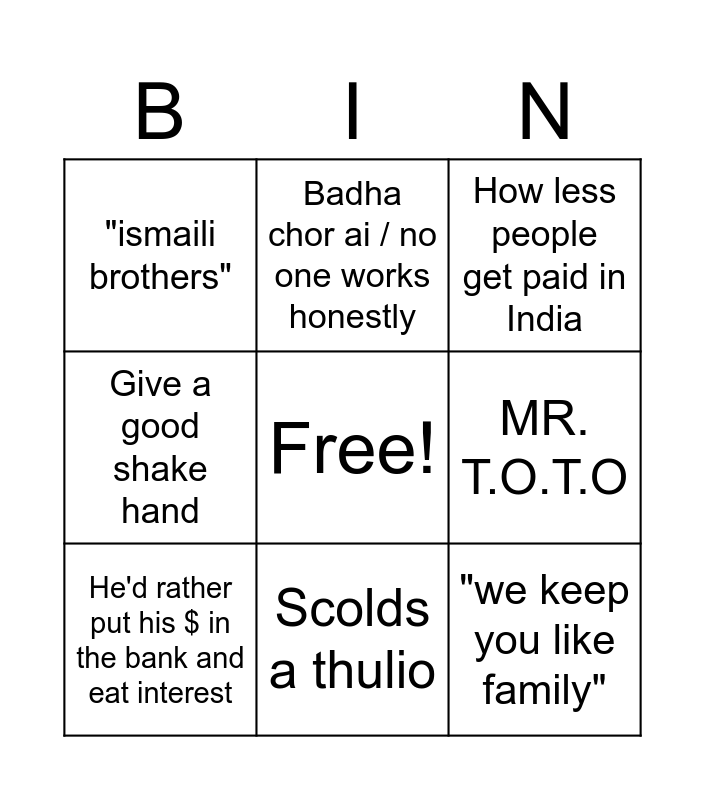 This bingo card has a free space and 9 words: He'd rather put his $ in the bank and eat interest, How less people get paid in India, Badha chor ai / no one works honestly, Give a good shake hand, "ismaili brothers", MR. T.O.T.O, "we keep you like family", Farming = best business and Scolds a thulio.