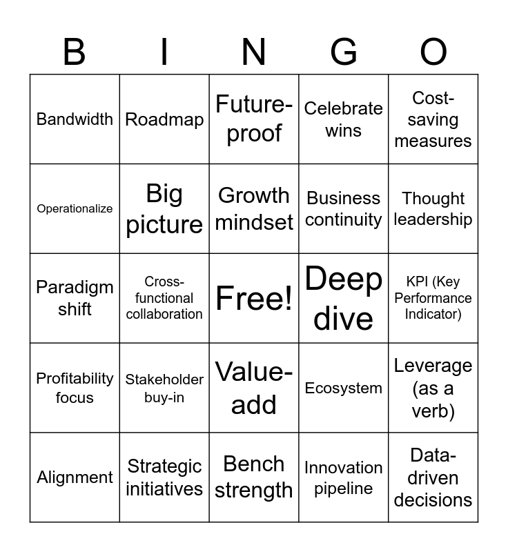 This bingo card has a free space and 55 words: Actionable insights, Alignment, At the end of the day, Bandwidth, Bench strength, Best practices, Big picture, Blue sky thinking, Business continuity, Business impact, Celebrate wins, Challenges ahead, Change management, Company-wide priorities, Competitive advantage, Core competency, Cost-saving measures, Cross-functional collaboration, Customer-centric, Data-driven decisions, Deep dive, Deliverables, Ecosystem, Future-proof, Go-to-market strategy, Growth mindset, Innovation pipeline, Key takeaway, KPI (Key Performance Indicator), Leverage (as a verb), Long-term vision, Milestone achieved, On track, Operational efficiency, Operationalize, Paradigm shift, Pivot, Profitability focus, Resource allocation, Risk mitigation, Roadmap, Scalable, Scaling up, Stakeholder alignment, Stakeholder buy-in, Strategic initiatives, Synergy, Team alignment, Think outside the box, Thought leadership, Touch base, Transformation journey, Transparency, Value-add and Win-win.