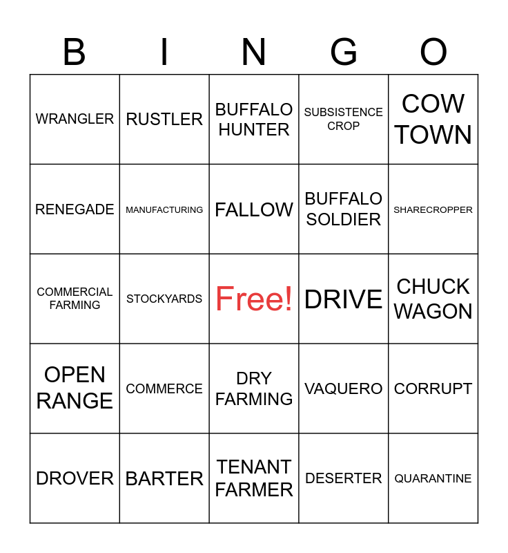 This bingo card has a free space and 28 words: CORRUPT, SINEW, BUFFALO SOLDIER, DESERTER, RENEGADE, BUFFALO HUNTER, RUSTLER, OPEN RANGE, DRIVE, DROVER, COMMERCIAL FARMING, SUBSISTENCE CROP, BARTER, TENANT FARMER, SHARECROPPER, LANDLORD, COMMERCE, MANUFACTURING, FALLOW, DRY FARMING, WRANGLER, ROUNDUP, QUARANTINE, STOCKYARDS, CHUCK WAGON, VAQUERO, COW TOWN and BRAND.