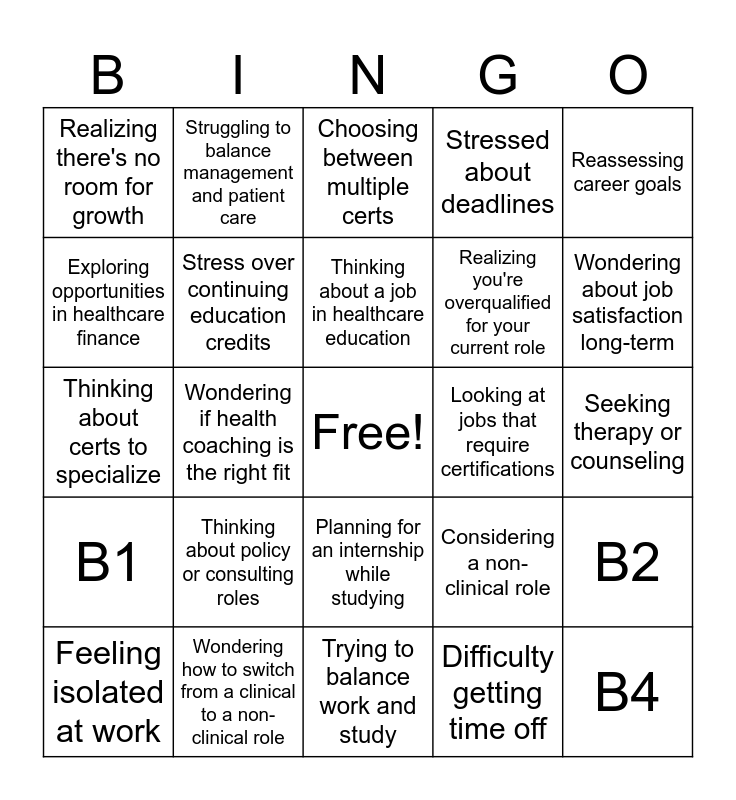 This bingo card has a free space and 614 words: B1, B2, B3, B4, B5, Struggling to decide on a certification, Can’t afford certification fees, Confused by certification updates, Researching different programs, Joining a certification-focused study group, Long waitlists for certification exams, Considering online courses, Stress over continuing education credits, Finding local certification options, Trying to balance work and study, Looking at jobs that require certifications, Choosing between multiple certs, Getting advice from industry professionals, Wondering if certifications are necessary, Planning for an internship while studying, Free webinars but no hands-on experience, Certification requirements vary by state, Delayed exams due to COVID-19, Stressed about deadlines, Finding affordable resources for exam prep, Changing career direction after certification, Too many certification options, Struggling with exam prep, Thinking about certs to specialize, Researching job openings needing certifications, 2. "Burnout in Health Care" Bingo Board, B1, B2, B3, B4, B5, Feeling physically drained, Too much paperwork, Low morale at work, Considering a career change, Overworked and underpaid, Getting frustrated with patient load, Lack of work-life balance, Stressed about hospital staffing, Not enough support from management, No time for personal wellness, Thinking of transitioning to a new role, Looking for ways to prevent burnout, Considering part-time options, Seeking therapy or counseling, Reassessing career goals, Talking to coworkers about burnout, Noticing signs of emotional fatigue, Taking on extra shifts to make ends meet, Difficulty getting time off, Wondering about job satisfaction long-term, Considering a non-clinical role, Feeling isolated at work, Lack of growth opportunities, Overwhelmed by administrative tasks, Researching jobs with less stress, 3. "Stuck in Health Administration" Bingo Board, B1, B2, B3, B4, B5, Missing direct patient care, Frustrated with office politics, Looking for leadership roles, Realizing there's no room for growth, Contemplating switching to another department, Seeking mentorship from other admins, Feeling disconnected from health impact, Wondering if you should go back to school, Lack of meaningful feedback from superiors, Thinking about policy or consulting roles, Considering a career in health technology, Spending too much time on meetings, Finding no motivation to lead, Wanting to impact health system change, Struggling to balance management and patient care, Exploring opportunities in healthcare finance, Realizing you're overqualified for your current role, Looking into project management roles, Reassessing priorities in the healthcare field, Trying to network with other admins, Considering shifting into a non-clinical healthcare role, Dealing with underappreciated staff, Not feeling challenged in current position, Wanting more professional development, Researching a new healthcare role outside administration, 4. "Exploring a Non-Traditional Health Career" Bingo Board, B1, B2, B3, B4, B5, Interested in health informatics, Wondering if health coaching is the right fit, Researching careers in wellness, Thinking about public health data analysis, Looking at non-clinical roles, Unsure if non-traditional health jobs pay well, Wondering if there are certifications for new career paths, Looking into digital health startups, Considering alternative medicine, Wondering how to switch from a clinical to a non-clinical role, Exploring telemedicine career options, Researching health technology fields, Looking for online courses to switch careers, Considering starting a health blog or podcast, Thinking about a job in healthcare education, Challenged by non-traditional career pathways, Networking with people in alternative health careers, Struggling with the idea of career change, Wondering if a career in health tech is feasible, Trying to figure out which field is best for you, Attending conferences to explore non-traditional roles, Looking for a mentor in a non-clinical career, Researching non-traditional health job postings, Considering freelance or consulting work, Nervous about entering a new career space, B1, B2, B3, B4, B5, Struggling to decide on a certification, Can’t afford certification fees, Confused by certification updates, Researching different programs, Joining a certification-focused study group, Long waitlists for certification exams, Considering online courses, Stress over continuing education credits, Finding local certification options, Trying to balance work and study, Looking at jobs that require certifications, Choosing between multiple certs, Getting advice from industry professionals, Wondering if certifications are necessary, Planning for an internship while studying, Free webinars but no hands-on experience, Certification requirements vary by state, Delayed exams due to COVID-19, Stressed about deadlines, Finding affordable resources for exam prep, Changing career direction after certification, Too many certification options, Struggling with exam prep, Thinking about certs to specialize, Researching job openings needing certifications, 2. "Burnout in Health Care" Bingo Board, B1, B2, B3, B4, B5, Feeling physically drained, Too much paperwork, Low morale at work, Considering a career change, Overworked and underpaid, Getting frustrated with patient load, Lack of work-life balance, Stressed about hospital staffing, Not enough support from management, No time for personal wellness, Thinking of transitioning to a new role, Looking for ways to prevent burnout, Considering part-time options, Seeking therapy or counseling, Reassessing career goals, Talking to coworkers about burnout, Noticing signs of emotional fatigue, Taking on extra shifts to make ends meet, Difficulty getting time off, Wondering about job satisfaction long-term, Considering a non-clinical role, Feeling isolated at work, Lack of growth opportunities, Overwhelmed by admini