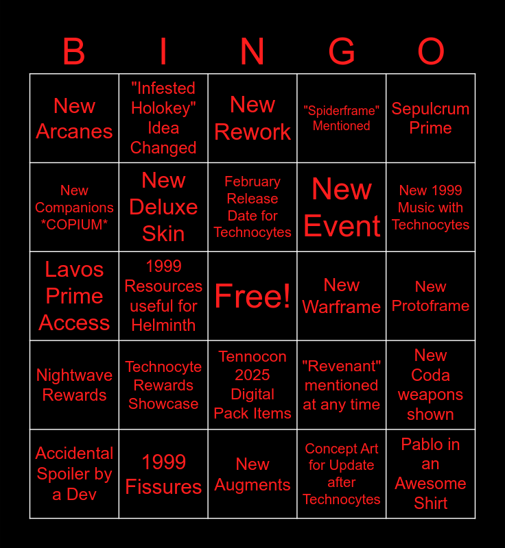 This bingo card has a free space and 24 words: Technocyte Rewards Showcase, 1999 Fissures, February Release Date for Technocytes, Accidental Spoiler by a Dev, Sepulcrum Prime, New Arcanes, New Companions *COPIUM*, "Infested Holokey" Idea Changed, New Warframe, Tennocon 2025 Digital Pack Items, New Event, Lavos Prime Access, "Revenant" mentioned at any time, New Coda weapons shown, New Deluxe Skin, Concept Art for Update after Technocytes, New Protoframe, New Rework, New 1999 Music with Technocytes, 1999 Resources useful for Helminth, Pablo in an Awesome Shirt, Nightwave Rewards, "Spiderframe" Mentioned and New Augments.