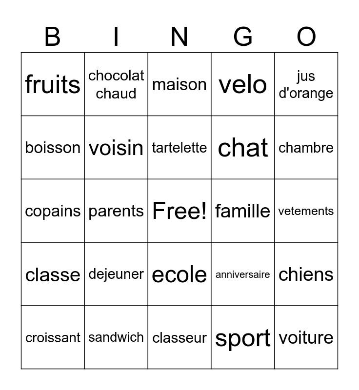 This bingo card has a free space and 24 words: dejeuner, sandwich, tartelette, croissant, jus d'orange, fruits, boisson, chocolat chaud, famille, ecole, chat, copains, anniversaire, chiens, voisin, sport, vetements, maison, chambre, parents, voiture, classe, velo and classeur.