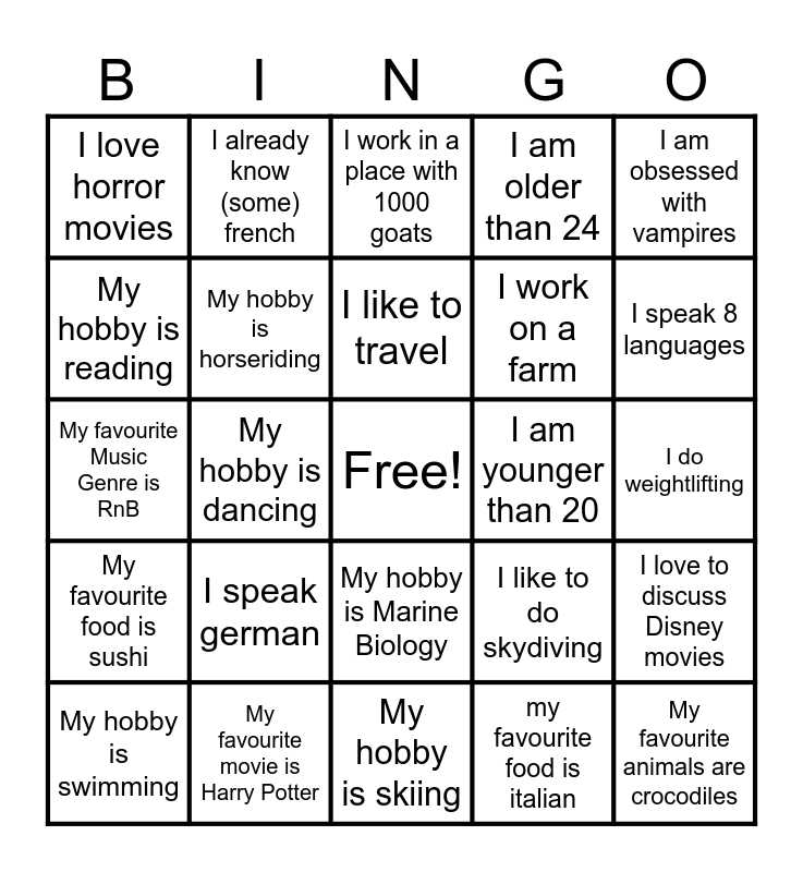 This bingo card has a free space and 24 words: I speak german, My favourite movie is Harry Potter, I like to travel, My hobby is swimming, I am obsessed with vampires, I love horror movies, My hobby is reading, I already know (some) french, I am younger than 20, My hobby is Marine Biology, I work on a farm, My favourite Music Genre is RnB, I like to do skydiving, I love to discuss Disney movies, My hobby is horseriding, my favourite food is italian, I do weightlifting, I work in a place with 1000 goats, I speak 8 languages, My hobby is dancing, My favourite animals are crocodiles, My favourite food is sushi, I am older than 24 and My hobby is skiing.