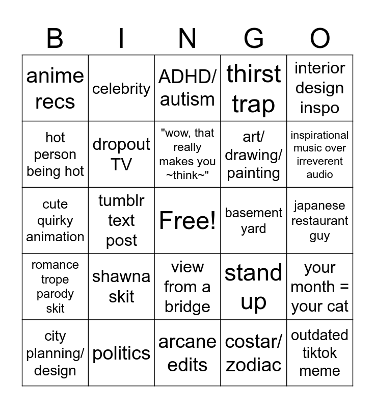This bingo card has a free space and 31 words: arcane edits, sewing/ knitting, tumblr text post, cat, anime recs, ADHD/ autism, dropout TV, stand up, basement yard, costar/ zodiac, japanese restaurant guy, outdated tiktok meme, broski report, property tour, inspirational music over irreverent audio, russian/ german voiceover, your month = your cat, shawna skit, romance trope parody skit, view from a bridge, interior design inspo, communication advice, city planning/ design, celebrity, art/ drawing/ painting, hot person being hot, thirst trap, cute quirky animation, politics, "wow, that really makes you ~think~" and dancing.