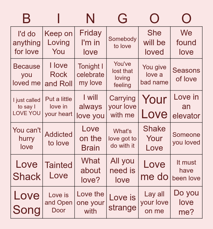 This bingo card has 50 words: The Power of Love, I just called to say I LOVE YOU, What the world needs now (is Love sweet Love), Shake Your Love, Your Love, Love is and Open Door, Keep on Loving You, Love lifts us up where we belong, We found love, Love the one your with, Because you loved me, Somebody to love, Addicted to love, You can't hurry love, Rhythm of love, All you need is love, I love Rock and Roll, Put a little love in your heart, Free!, She will be loved, Seasons of love, Someone you loved, I'd do anything for love, Tonight I celebrate my love, D.J. got us falling in love, Love Shack, You've lost that loving feeling, Burning Love, Friday I'm in love, Love in an elevator, One Love, Love me do, Higher love, Make me feel my love, What's love got to do with it, What about love?, Love is strange, Lay all your love on me, Do you love me?, I will always love you, Love Song, Baby Love, It must have been love, Love me Tender, Love on the Brain, You give love a bad name, Tainted Love, Come and get your love, Carrying your love with me and I like it I love it.