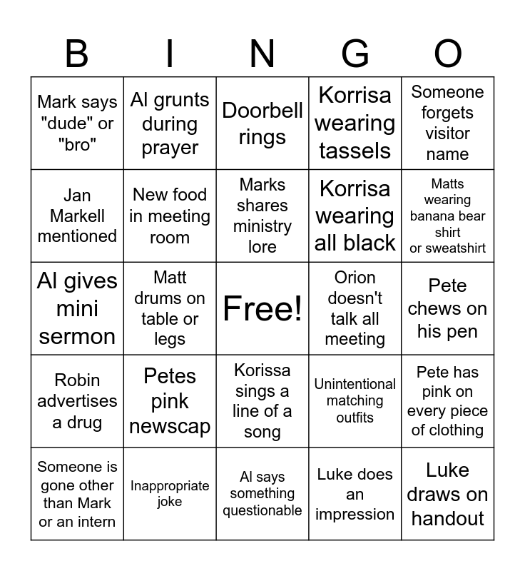 This bingo card has a free space and 34 words: Maryn makes a pun, Luke does an impression, Chalk talk, Mark is gone, Robin advertises a drug, New food in meeting room, Someone forgets visitor name, Someone is gone other than Mark or an intern, Al grunts during prayer, Luke fake laughs, Marks shares ministry lore, Doorbell rings, Dramatic reaction from Robin, Maryn makes a noise during prayer, Orion doesn't talk all meeting, Matts wearing banana bear shirt or sweatshirt, Inappropriate joke, Al gives mini sermon, Petes pink newscap, Unintentional matching outfits, Korissa sings a line of a song, Phone goes off, Mark says "dude" or "bro", Pete chews on his pen, Al says something questionable, Luke draws on handout, Korrisa wearing tassels, Nate says "great question", Korrisa wearing all black, Jan Markell mentioned, Al or Leanne call themself old, Matt drums on table or legs, Pete has pink on every piece of clothing and Jeremiah wearing Adidas.