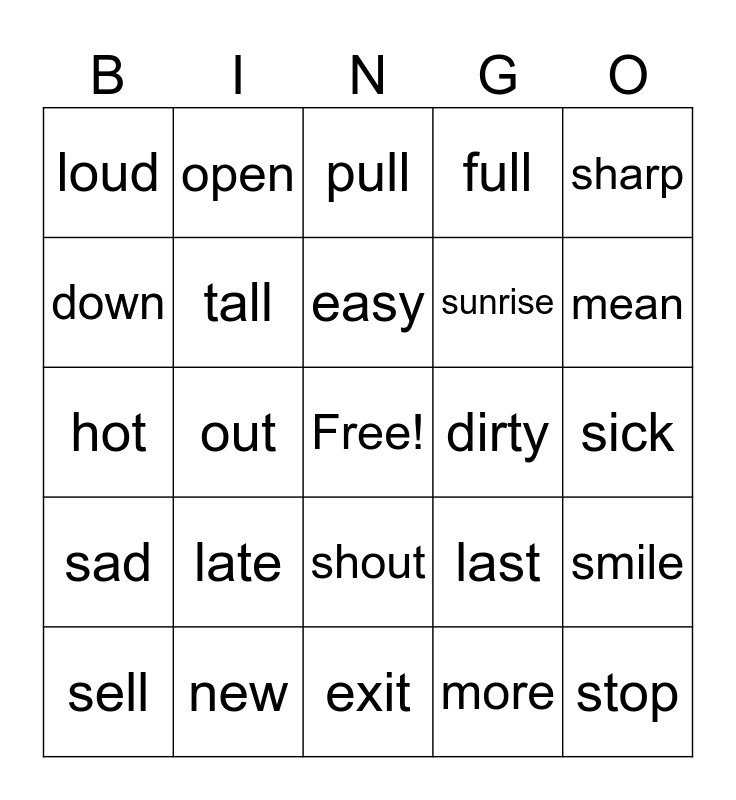 This bingo card has a free space and 24 words: late, new, easy, sell, sharp, loud, down, open, dirty, shout, sunrise, hot, last, smile, tall, more, sick, pull, mean, out, stop, sad, full and exit.