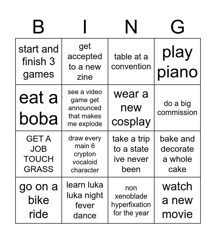 This bingo card has 16 words: learn luka luka night fever dance, bake and decorate a whole cake, table at a convention, start and finish 3 games, GET A JOB TOUCH GRASS, get accepted to a new zine, take a trip to a state ive never been, non xenoblade hyperfixation for the year, eat a boba, see a video game get announced that makes me explode, go on a bike ride, play piano, draw every main 6 crypton vocaloid character, do a big commission, wear a new cosplay and watch a new movie.