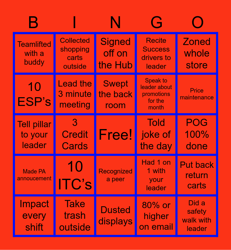 This bingo card has a free space and 24 words: 10 ITC’s, Take trash outside, Swept the back room, Impact every shift, Zoned whole store, Teamlifted with a buddy, 10 ESP’s, Collected shopping carts outside, Told joke of the day, Recognized a peer, Speak to leader about promotions for the month, Tell pillar to your leader, Had 1 on 1 with your leader, Put back return carts, Lead the 3 minute meeting, 80% or higher on email, POG 100% done, Signed off on the Hub, Price maintenance, 3 Credit Cards, Did a safety walk with leader, Made PA annoucement, Recite Success drivers to leader and Dusted displays.