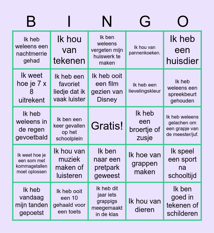 This bingo card has a free space and 24 words: Ik hou van muziek maken of luisteren, Ik heb ooit een 10 gehaald voor een toets, Ik heb ooit een film gezien van Disney, Ik heb vandaag mijn tanden gepoetst, Ik heb een huisdier, Ik heb weleens een nachtmerrie gehad, Ik weet hoe je 7 x 8 uitrekent, Ik hou van tekenen, Ik heb een broertje of zusje, Ik ben naar een pretpark geweest, Ik heb een lievelingskleur, Ik heb weleens in de regen gevoetbald, Ik hoe van grappen maken, Ik speel een sport na schooltijd, Ik heb een favoriet liedje dat ik vaak luister, Ik hou van dieren, Ik heb weleens gelachen om een grapje van de meester/juf., Ik ben weleens vergeten mijn huiswerk te maken, Ik heb weleens een spreekbeurt gehouden, Ik ben een keer gevallen op het schoolplein, Ik ben goed in tekenen of schilderen, Ik weet hoe je een som met kommagetallen moet oplossen, Ik hou van pannenkoeken. and Ik heb dit jaar iets grappigs meegemaakt in de klas.