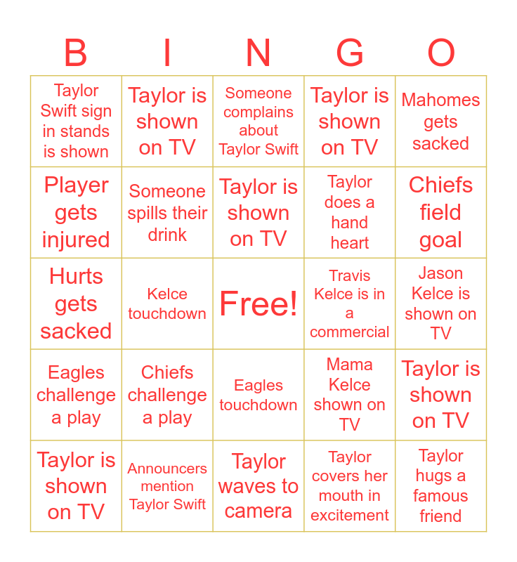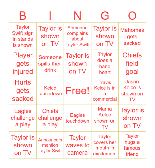 This bingo card has a free space and 29 words: Taylor is shown on TV, Chiefs touchdown, Kelce touchdown, Beer commercial, Taylor Swift sign in stands is shown, Someone complains about Taylor Swift, Someone spills their drink, Chiefs challenge a play, Travis Kelce is in a commercial, Announcers mention Taylor Swift, Jason Kelce is shown on TV, Taylor hugs a famous friend, Taylor waves to camera, Taylor covers her mouth in excitement, Chiefs field goal, Eagles field goal, Eagles touchdown, Eagles challenge a play, Mahomes gets sacked, Hurts gets sacked, Mama Kelce shown on TV, Kendrick Lamar performs "Not Like Us", Taylor does a hand heart, Player gets injured, Taylor is shown on TV, Taylor is shown on TV, Taylor is shown on TV, Taylor is shown on TV and Taylor is shown on TV.