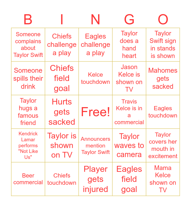 This bingo card has a free space and 24 words: Taylor is shown on TV, Chiefs touchdown, Kelce touchdown, Beer commercial, Taylor Swift sign in stands is shown, Someone complains about Taylor Swift, Someone spills their drink, Chiefs challenge a play, Travis Kelce is in a commercial, Announcers mention Taylor Swift, Jason Kelce is shown on TV, Taylor hugs a famous friend, Taylor waves to camera, Taylor covers her mouth in excitement, Chiefs field goal, Eagles field goal, Eagles touchdown, Eagles challenge a play, Mahomes gets sacked, Hurts gets sacked, Mama Kelce shown on TV, Kendrick Lamar performs "Not Like Us", Taylor does a hand heart and Player gets injured.