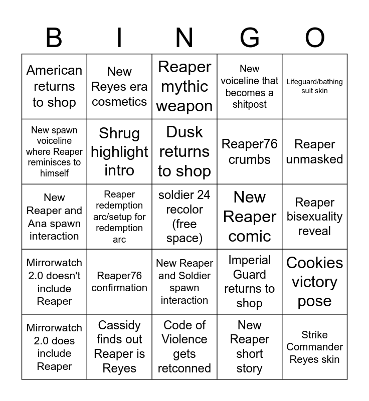 This bingo card has a free space and 24 words: Reaper76 confirmation, Cassidy finds out Reaper is Reyes, Dusk returns to shop, Mirrorwatch 2.0 does include Reaper, Lifeguard/bathing suit skin, American returns to shop, New spawn voiceline where Reaper reminisces to himself, New Reyes era cosmetics, New Reaper comic, New Reaper and Soldier spawn interaction, Reaper76 crumbs, New Reaper and Ana spawn interaction, Imperial Guard returns to shop, Cookies victory pose, Shrug highlight intro, New Reaper short story, Reaper bisexuality reveal, Reaper mythic weapon, Reaper unmasked, Reaper redemption arc/setup for redemption arc, Strike Commander Reyes skin, Mirrorwatch 2.0 doesn't include Reaper, New voiceline that becomes a shitpost and Code of Violence gets retconned.