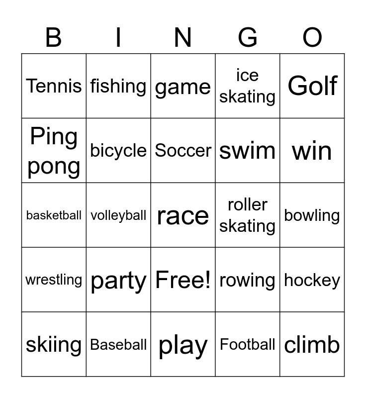 This bingo card has 26 words: Free!, Football, Soccer, Baseball, Golf, Tennis, Ping pong, fishing, bowling, rowing, swim, basketball, hockey, skiing, volleyball, boxing, ice skating, wrestling, game, race, win, play, roller skating, party, bicycle and climb.