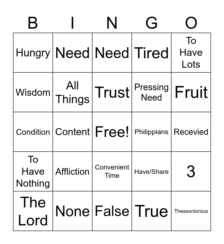 This bingo card has a free space and 29 words: The Lord, Opportunity, Content, Abound, Hungry, Need, All Things, Affliction, Philippians, None, Recevied, Thessonlonica, False, True, Fruit, Riches in Glory, Convenient Time, To Have Nothing, To Have Lots, Condition, Have/Share, Pain/Suffering, Pressing Need, Wisdom, Tired, Need, 3, Trust and Timothy.