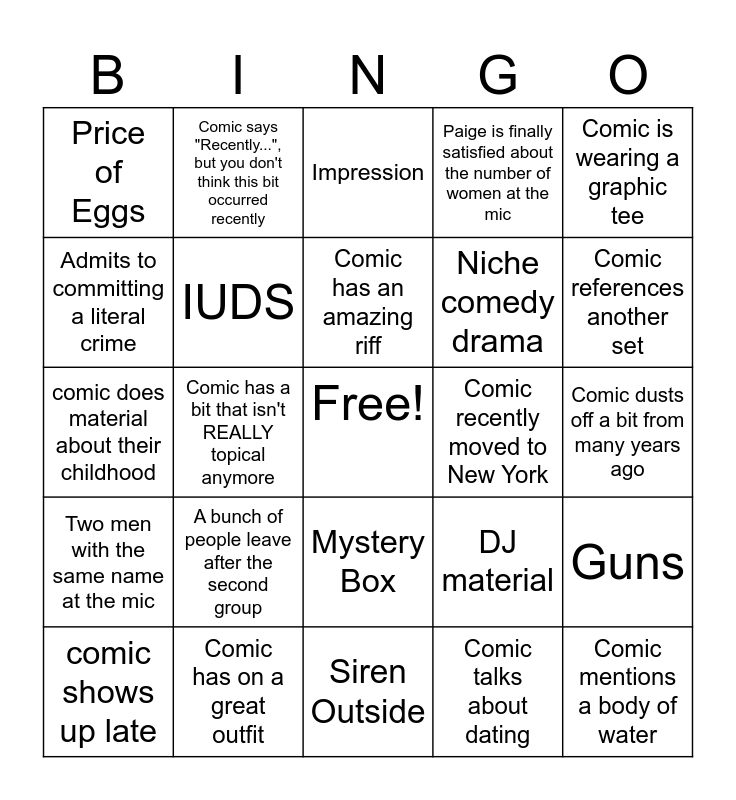 This bingo card has a free space and 24 words: A bunch of people leave after the second group, Comic has on a great outfit, Comic has an amazing riff, comic shows up late, Comic is wearing a graphic tee, Price of Eggs, Admits to committing a literal crime, Comic says "Recently...", but you don't think this bit occurred recently, Comic recently moved to New York, Mystery Box, Niche comedy drama, comic does material about their childhood, DJ material, Guns, IUDS, Comic talks about dating, Comic dusts off a bit from many years ago, Impression, Comic references another set, Comic has a bit that isn't REALLY topical anymore, Comic mentions a body of water, Two men with the same name at the mic, Paige is finally satisfied about the number of women at the mic and Siren Outside.