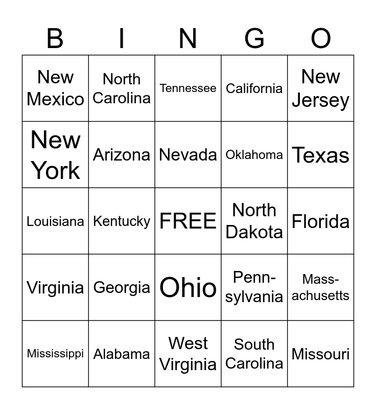 This bingo card has a free space and 24 words: Georgia, Alabama, Nevada, Mississippi, New Jersey, New Mexico, New York, North Carolina, North Dakota, Ohio, Oklahoma, Louisiana, Penn- sylvania, Mass- achusetts, Arizona, South Carolina, Florida, Tennessee, Texas, Kentucky, Missouri, Virginia, California and West Virginia.