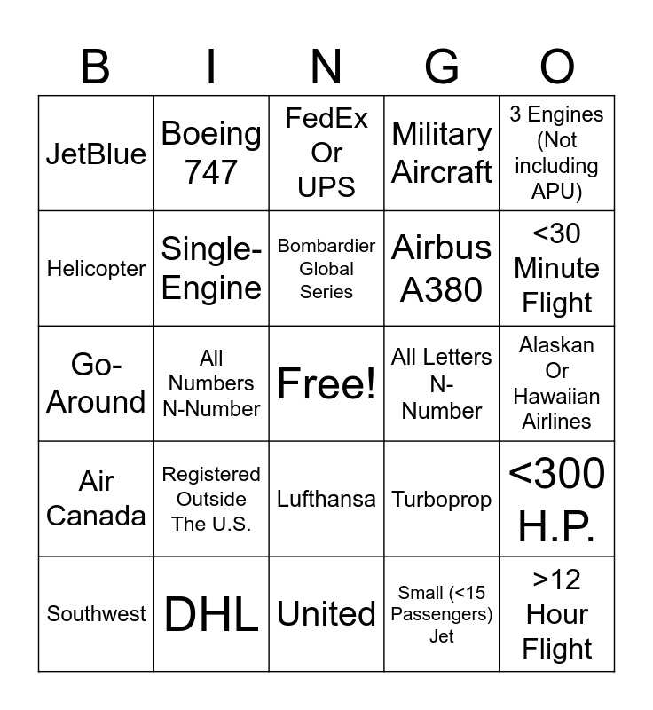 This bingo card has a free space and 24 words: Registered Outside The U.S., DHL, Bombardier Global Series, Southwest, 3 Engines (Not including APU), JetBlue, Helicopter, Boeing 747, All Letters N-Number, Lufthansa, Airbus A380, Go-Around, Turboprop, <300 H.P., Single-Engine, Small (<15 Passengers) Jet, Alaskan Or Hawaiian Airlines, FedEx Or UPS, <30 Minute Flight, All Numbers N-Number, >12 Hour Flight, Air Canada, Military Aircraft and United.