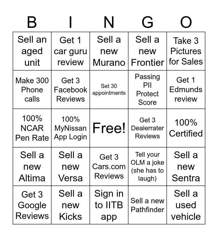 This bingo card has a free space and 24 words: Get 3 Google Reviews, Sell a new Versa, Set 30 appointments, Sell a new Pathfinder, Take 3 Pictures for Sales, Sell an aged unit, Get 1 car guru review, Sell a new Murano, Get 3 Dealerrater Reviews, 100% Certified, 100% NCAR Pen Rate, Get 3 Facebook Reviews, Tell your OLM a joke (she has to laugh), Sell a new Sentra, Make 300 Phone calls, Sell a new Kicks, Sign in to IITB app, Sell a new Frontier, Get 1 Edmunds review, Sell a new Altima, 100% MyNissan App Login, Get 3 Cars.com Reviews, Passing PII Protect Score and Sell a used vehicle.