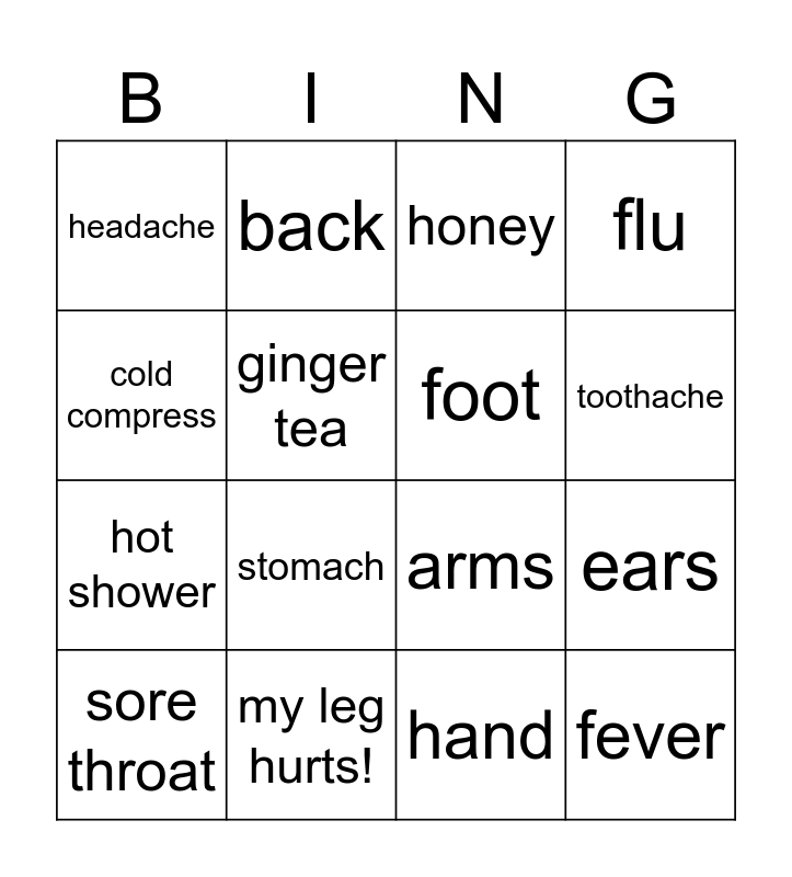 This bingo card has 16 words: my leg hurts!, ears, honey, headache, hot shower, back, arms, hand, cold compress, ginger tea, sore throat, flu, stomach, toothache, foot and fever.