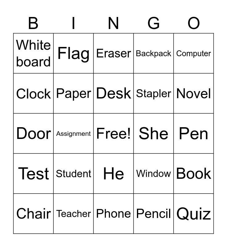 This bingo card has a free space and 24 words: Student, Teacher, Desk, Chair, Computer, White board, Clock, Flag, She, He, Stapler, Door, Window, Book, Paper, Pencil, Pen, Eraser, Novel, Assignment, Quiz, Test, Backpack and Phone.