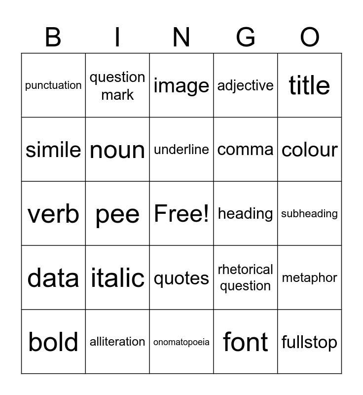 This bingo card has a free space and 24 words: bold, italic, underline, font, title, punctuation, question mark, image, heading, subheading, verb, noun, rhetorical question, metaphor, simile, alliteration, onomatopoeia, adjective, colour, data, pee, quotes, comma and fullstop.