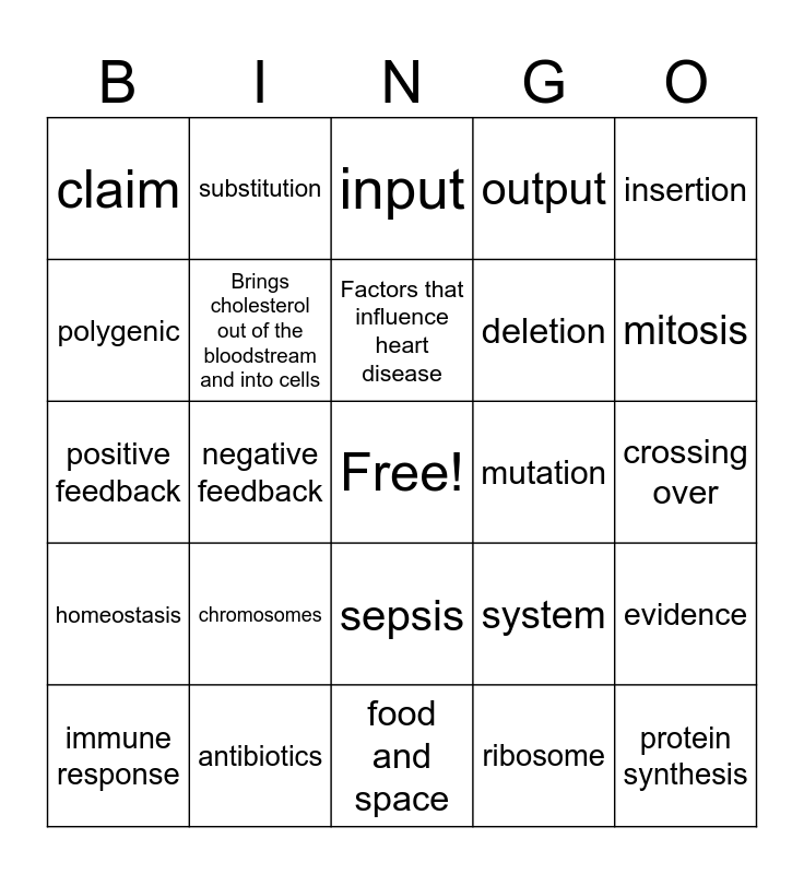 This bingo card has a free space and 28 words: evidence, reasoning, deletion, ribosome, polygenic, input, substitution, homeostasis, mutation, immune response, positive feedback, output, antibiotics, food and space, mitosis, meiosis, chromosomes, Brings cholesterol out of the bloodstream and into cells, Factors that influence heart disease, sepsis, claim, nucleus, protein synthesis, negative feedback, crossing over, system, insertion and alleles.